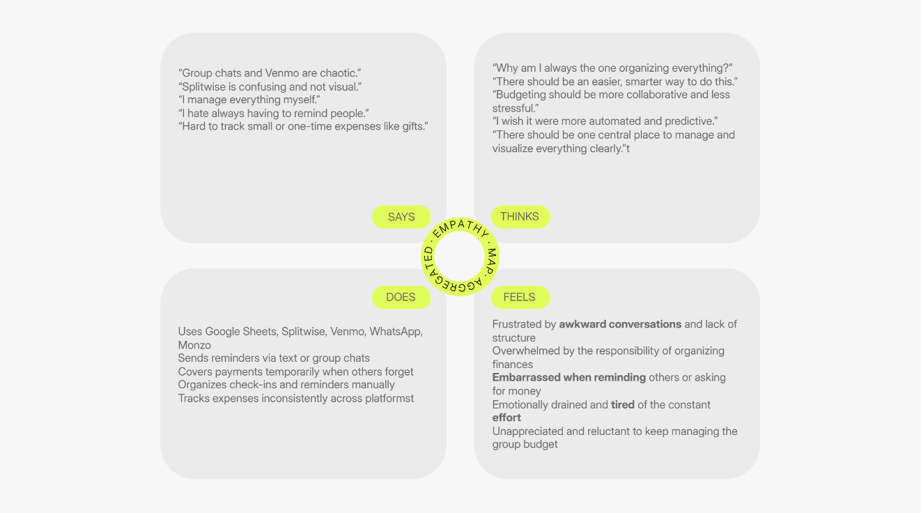 → simplify the experience of tracking and splitting expenses across different categories and group members?