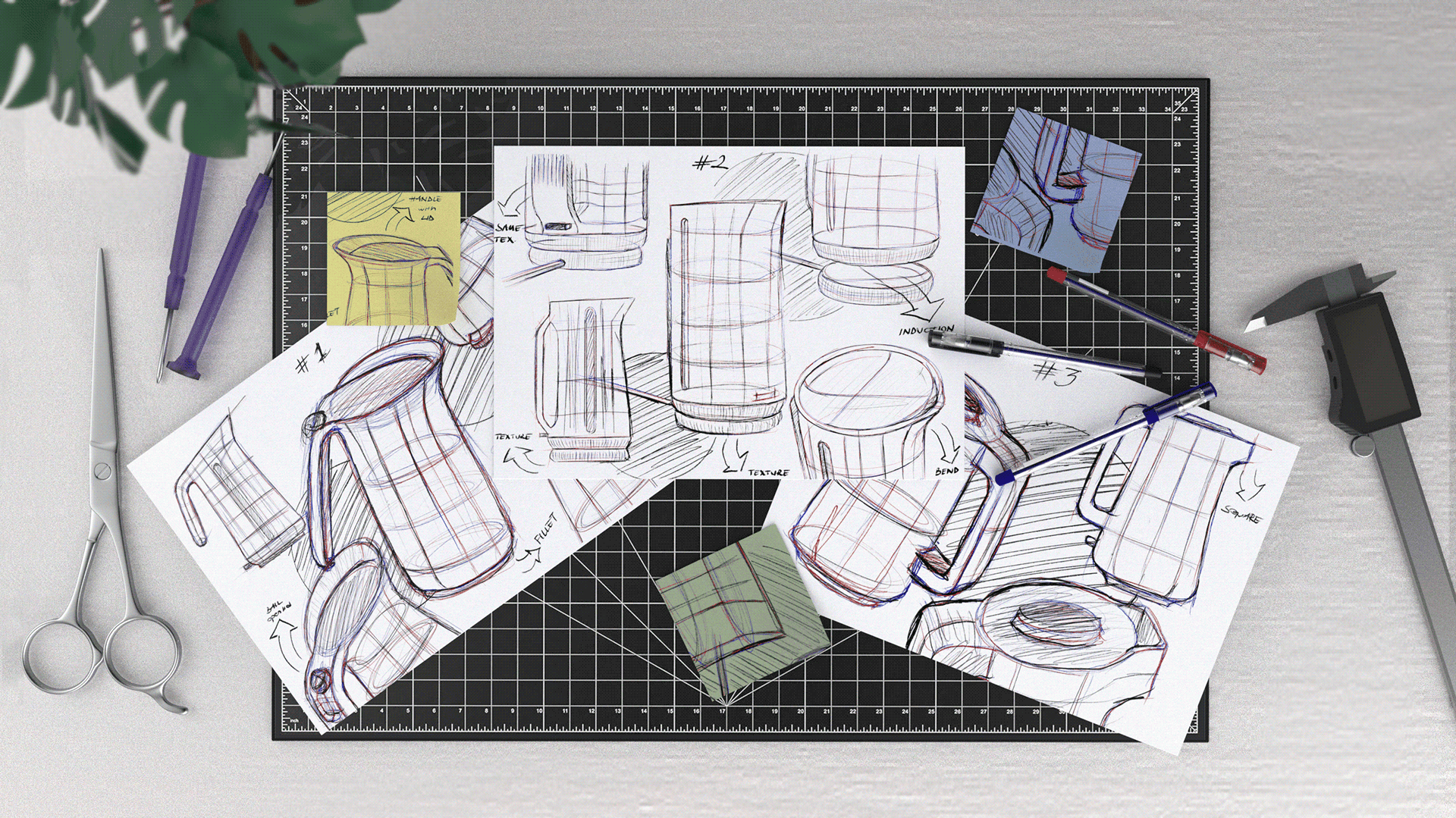 Working under time pressure, I quickly developed a range of sketches focused on handle integration, lid transitions, and base refinement. I aimed for a design language that would communicate soft precision and visual calm, while supporting intuitive interaction.