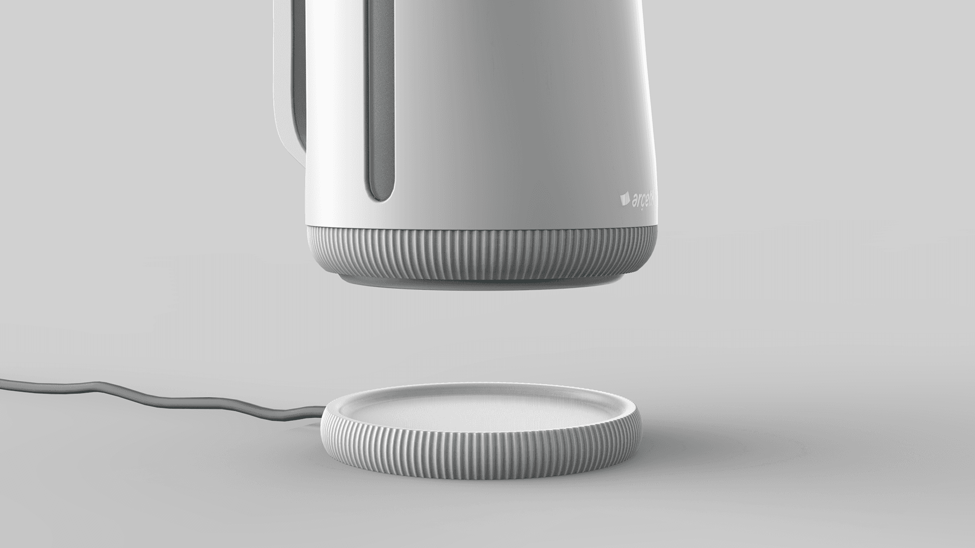 The final kettle design is defined by its simple, elegant form, offering a minimalist silhouette that blends effortlessly into modern kitchens. A key innovation is its use of induction technology, aligning the product with future-forward energy trends. The design emphasizes intuitive interaction, comfortable grip ergonomics, and a subtle base transition that gives it a light, floating feel on the countertop. The product’s surfaces and proportions were carefully considered to reflect clarity, calm, and confidence—three core visual drivers behind the design.
